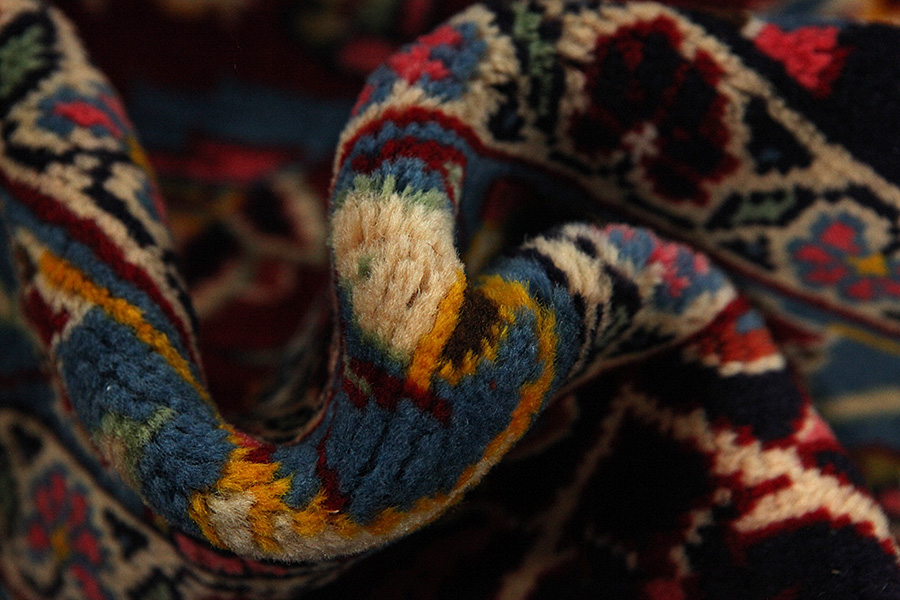 Abrash: P.g.a att ullen har olika mängder utav fett och salt, under färgningen suger ullet inte alltid upp samma mängd färg. Innan vävmingen syns inte det tydligt men efter vävningen får raderna olika färgnyanser. Det heter ( Abrash ) – och som på iranska betyder litet moln och visar naturligheten och äktheten i ullen då det inte använts kemiska medel. Exempel